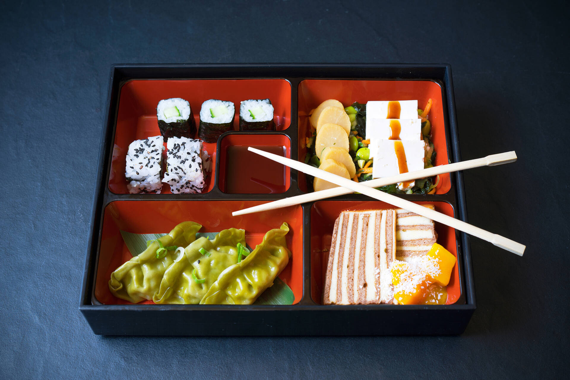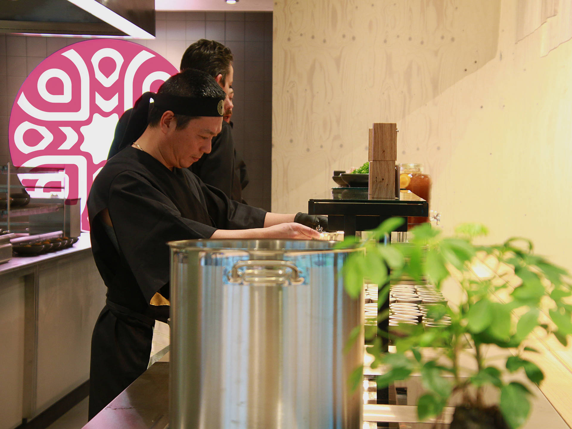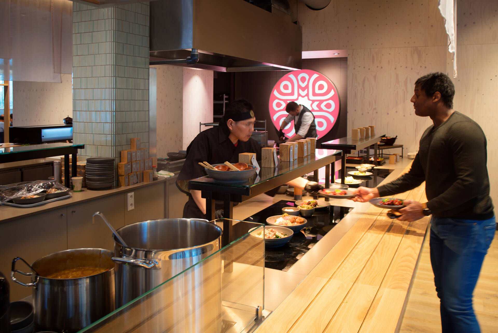 The dishes are made with fresh, daily dishes and vibrant flavors. The chefs are predominantly Japanese. Authentic dishes are prepared in full view of the guests. Think of savory Japanese pancakes (Okonomiyaki) and meat from the Robata grill. Also on the menu are easily digestible dishes that are to take away, including unique broths, spring rolls, and noodle dishes.